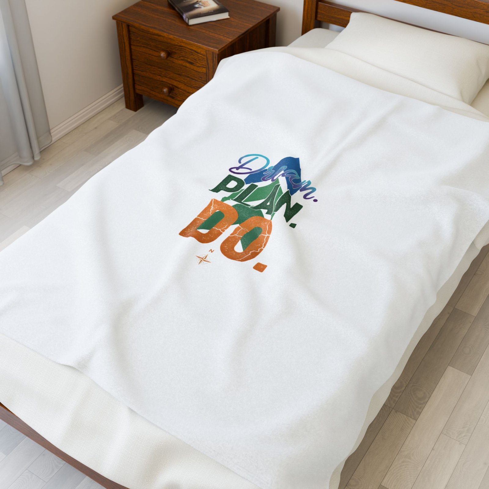 A plush, velvety blanket printed with a small, vibrant motivational design — ‘Dream. Plan. Do.’ layered over stylized mountains. Lightweight yet cozy, it wraps you in a soft, smooth touch and a quiet push to move from ideas to action. Drape it over a reading chair, keep it on your desk for cold office days, or fold it into your travel bag for inspiration on the go. The bright, high-detail print sits on one side, adding a splash of color without overwhelming the room. It feels like a gentle nudge on slow mornings and a calm companion during late-night work sessions.