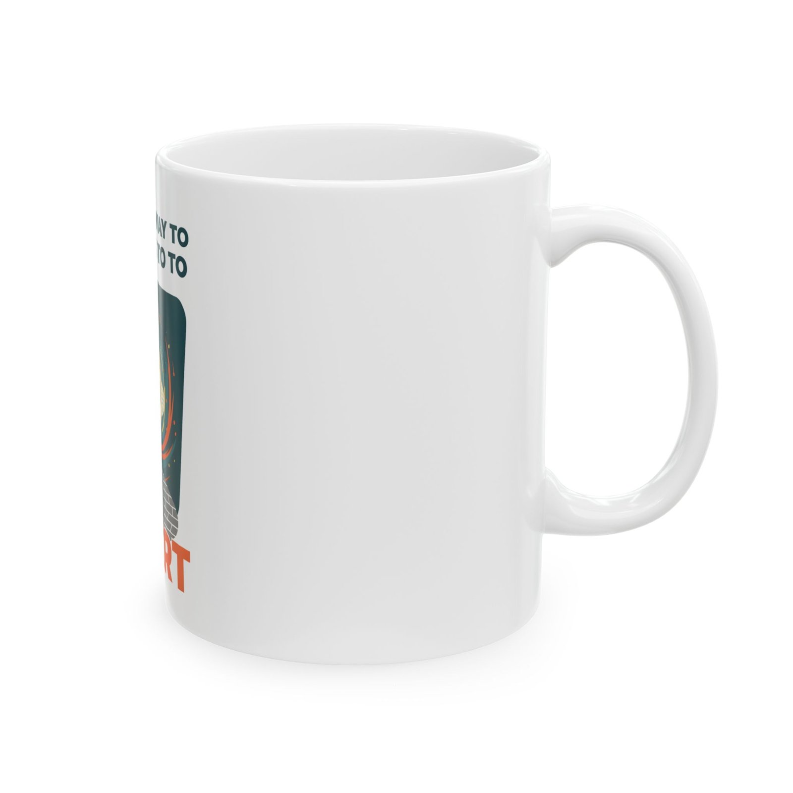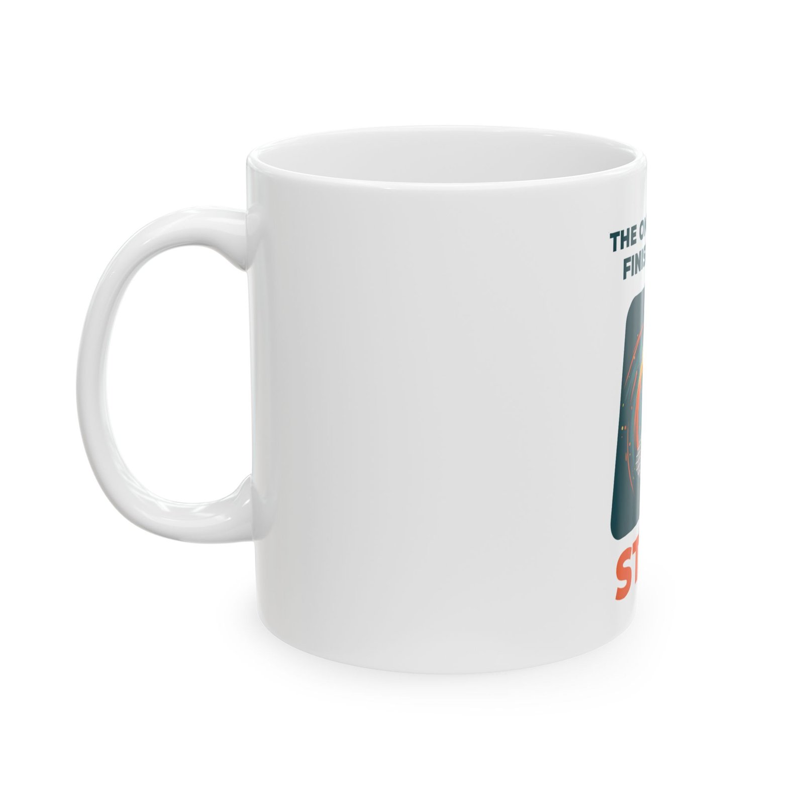 Sip something brave. This glossy ceramic mug features a bold, retro-inspired illustration of a swirling portal and a winding path beneath the phrase “The only way to finish is to START.” Bright, crisp inks pop against the durable white surface, turning a morning drink into a small ritual of momentum. It sits comfortably in the hand with a classic C-handle and adds a moment of focused encouragement to work desks, writing sessions, or commute coffee. Microwave- and dishwasher-safe, it’s built for daily use — a quiet nudge to begin, one cup at a time.