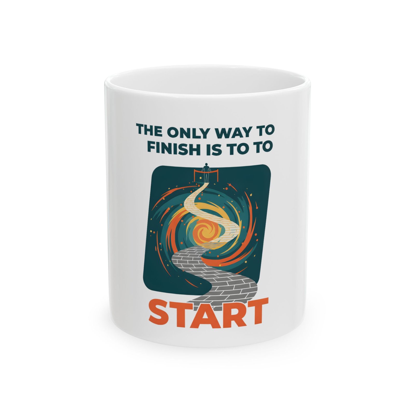 Motivational Ceramic Mug — “The Only Way to Finish is to Start” Inspirational Coffee Cup